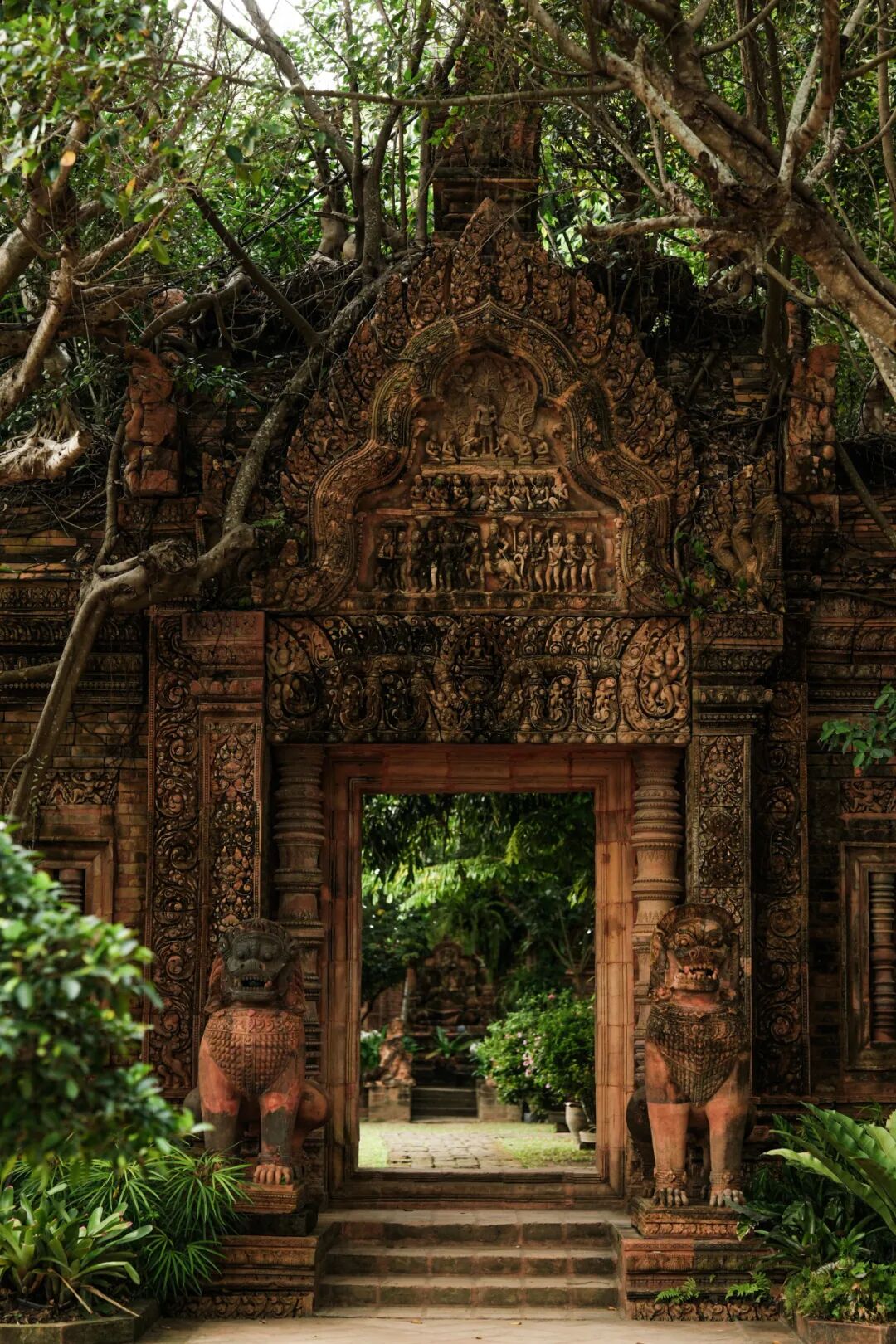 被称为吴哥窟咖啡馆(The Terracotta Garden)的园区在南奔的乡村地带,旁边的小村中种满了龙眼树,村中的小寺庙同样是以红陶砖建成,很多人以为这只是一处新建的打卡点,殊不知它是陶艺家的私人庄园,也是曾经的烧窑旧址。这里的建筑多用红陶建造,融合了兰纳文化与高棉艺术元素。园区在一片大树森林深处,园区内有大量红色陶砖制作的佛像、神兽雕塑、仿古佛塔以及内河竹桥。离咖啡馆不远处,还有两栋别墅,有本地人家居住,不知是否陶艺家的家人居住在此。还见一些工匠在砌砖,持续在建设。红陶青苔、藤蔓缠绕下,这里更像是一个大型的户外艺术公园。
