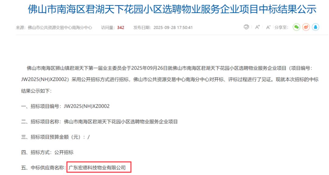 依据决议,君湖天下花园业委会于2025年9月委托招标代理公司,通过佛山市公共资源交易中心南海分中心发布招标公告;同年10月确定宏德物业中标,公示期间无任何异议。