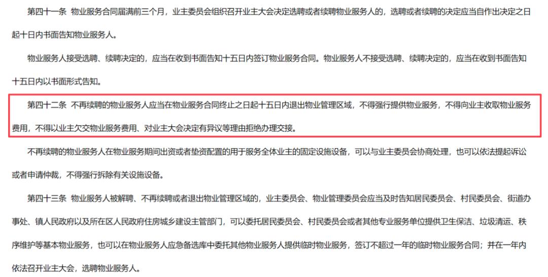 另据《佛山市住宅物业管理条例》第四十二条,不再续聘的物业服务人应当在物业服务合同终止之日起十五日内退出物业管理区域,不得以对业主大会决定有异议等理由拒绝办理交接。