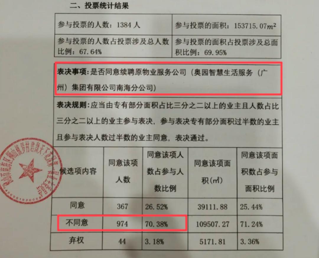 据君湖天下花园业委会对外披露,2025年4月,小区举行第一届业主大会,对“是否同意续聘原物业服务公司”“是否同意《南海区君湖天下小区物业服务合同》表决稿”等四项议题进行表决。