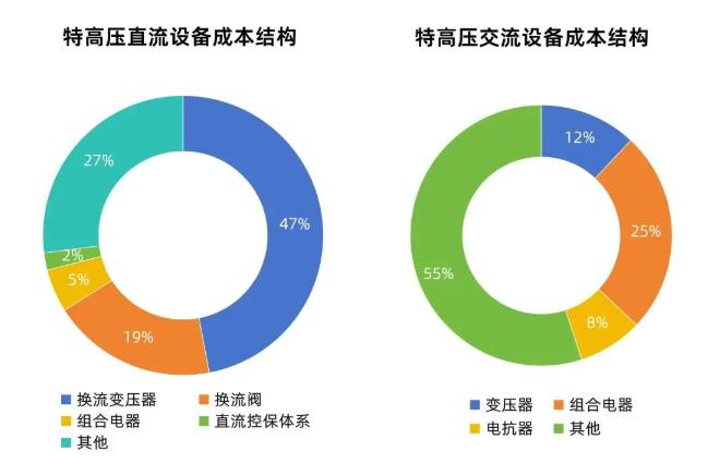 特高压产业链中游以核心设备制造为主,主要包括GIS、换流阀、变压器、控保系统等。直流与交流线路价值构成差异显著,在特高压直流项目中,换流变压器占比最高,达47%,换流阀次之,占19%,GIS约占5%。