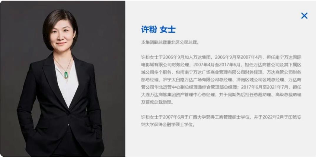 公开履历显示,许粉是在万达历练了20年的老将。许粉于2006年9月加入万达集团,最初担任南宁万达国际电影城有限公司财务经理。此后她在万达商管公司及其下属区域公司担任多个职务,2021年6月成为北区负责人。后出任大连万达商管集团资产管理中心总经理、总裁助理等职,2025年许粉担任珠海万达商管副总裁兼北区公司总裁,同时兼任北京、郑州等地万达广场商业管理公司执行董事、经理等职务。2023年荣获“全国巾帼建功标兵”称号,是王健林一手提拔上来的女高管。