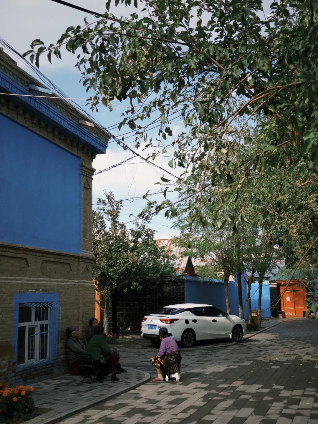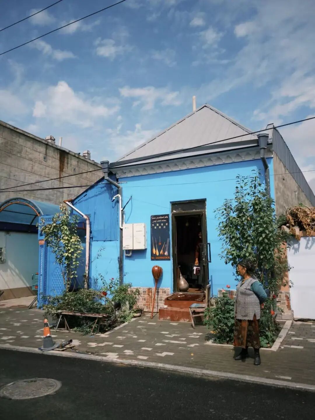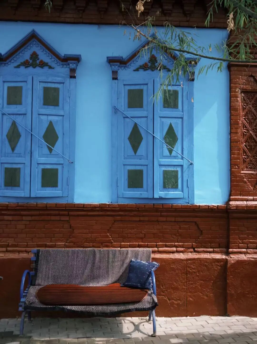 大巴扎的对面,就是喀赞其民俗旅游区。 如果时间充裕,除了打卡陕西大寺、吐达洪巴依大院等建筑,我更建议你从果园村或是伊犁街某处坑坑洼洼的岔路开始,随性地探索这片蓝色街区。许多民居会将外墙、窗户连同大门一起漆成蓝色。有一种说法是,人们长期生活在内陆,因此将房屋涂上天空与大海的颜色,聊以慰藉。
