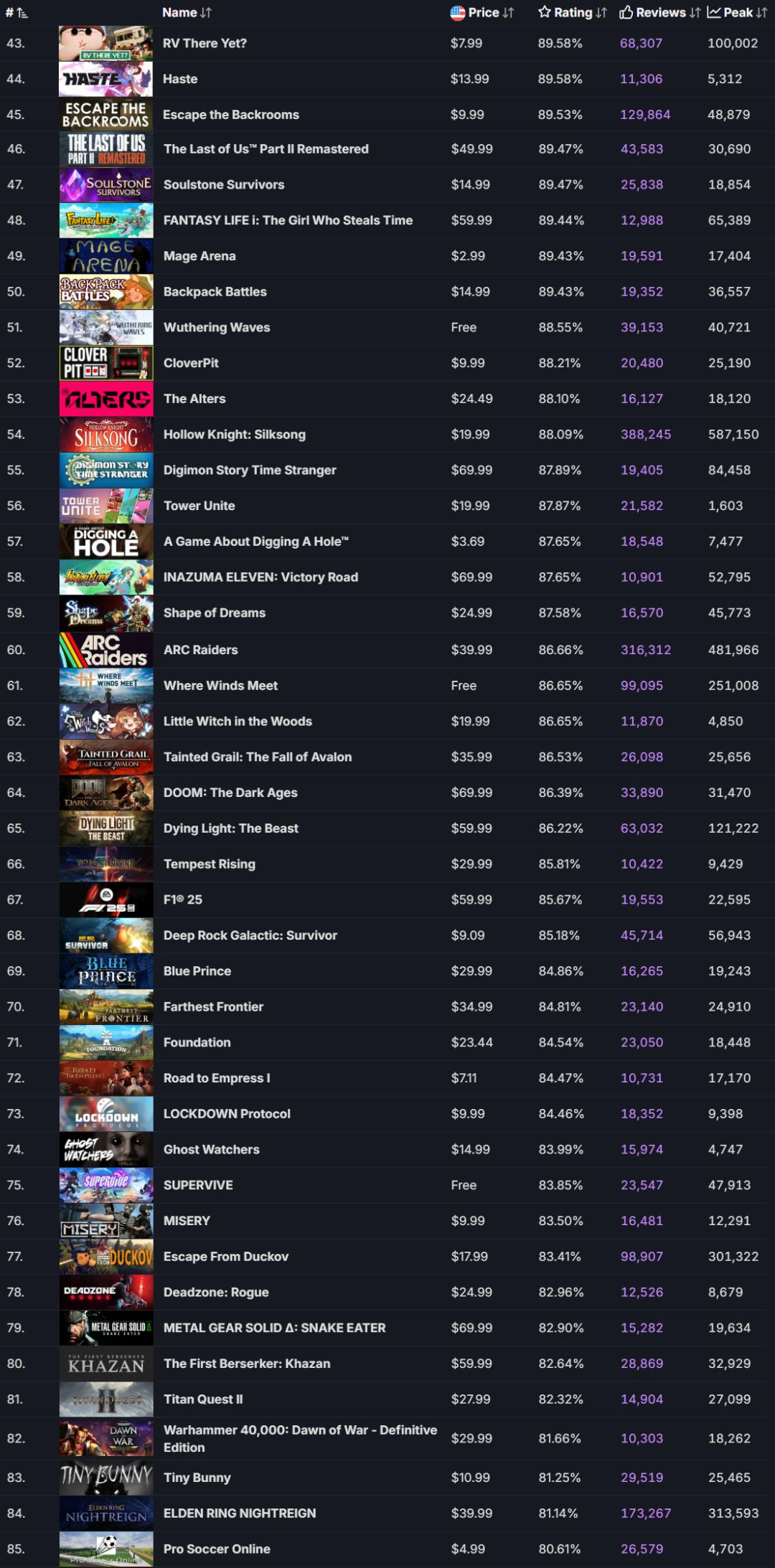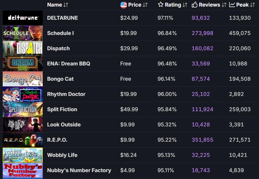 从这个角度出发,这次我们重点筛选了2025年Steam评论量超过10000的新游。