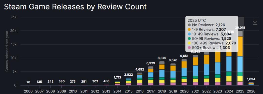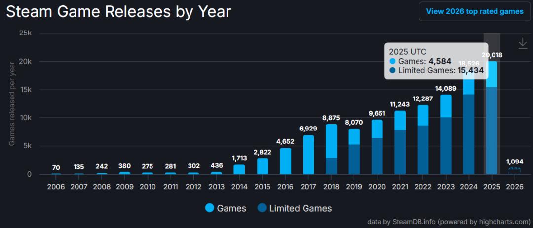 这一年Steam发售的新游数量也从2024年的18526款,增长至历史峰值的20018款,突破两万大关。其中,独占游戏多达15434款,占总数的77.1%。