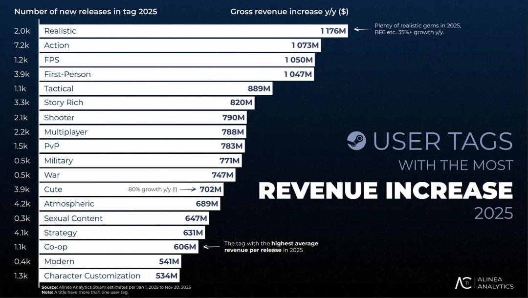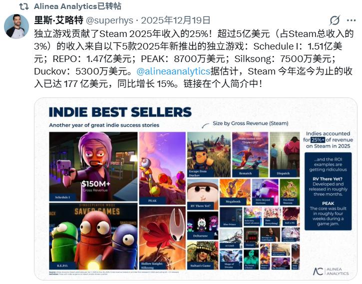 这一年Steam营收规模也突破了历史峰值,根据Alinea Analytics统计,截至2025年11月中旬,Steam年营收累计达到162亿美元,该数据在12月19日又突破至177亿美元(约1231亿元),同比增幅超过15%。值得一提的是,独立游戏占Steam总营收的25%。