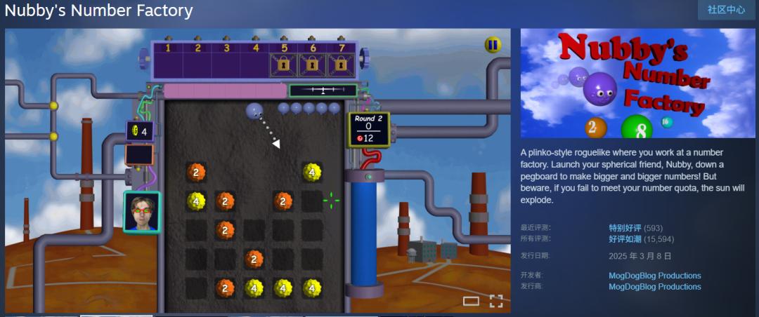 《Nubby's Number Factory》在前面也提到过,这款游戏在弹珠台x肉鸽的玩法创意上,更侧重画面简单但爽点爆炸的特色,和《幸运房东》有异曲同工之处。