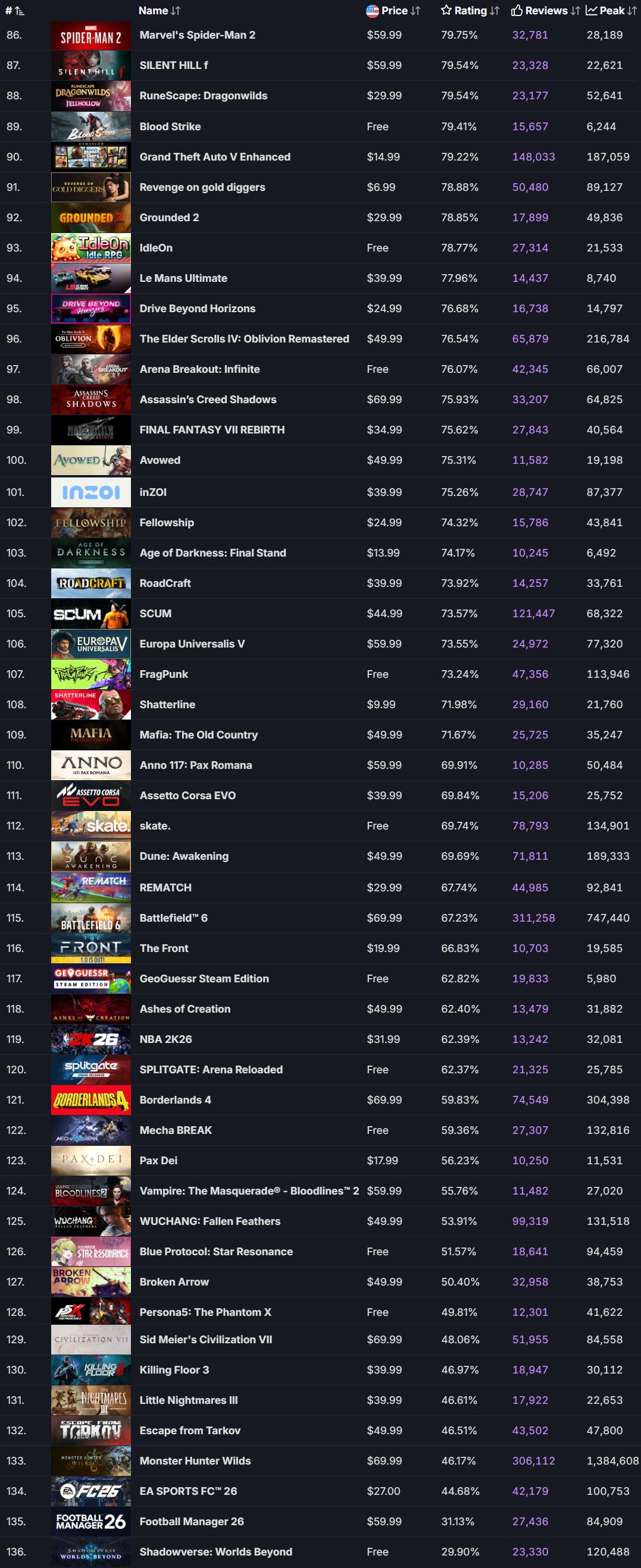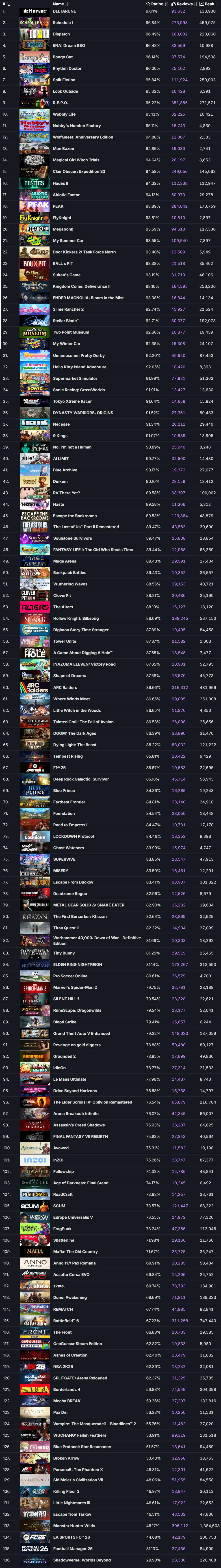 按照「万评」的条件,我们能筛选出136款在2025年发售的游戏(数据来源SteamDB,包含EA转正式和免费游戏,不含DLC和非游戏应用),详细列表如下: