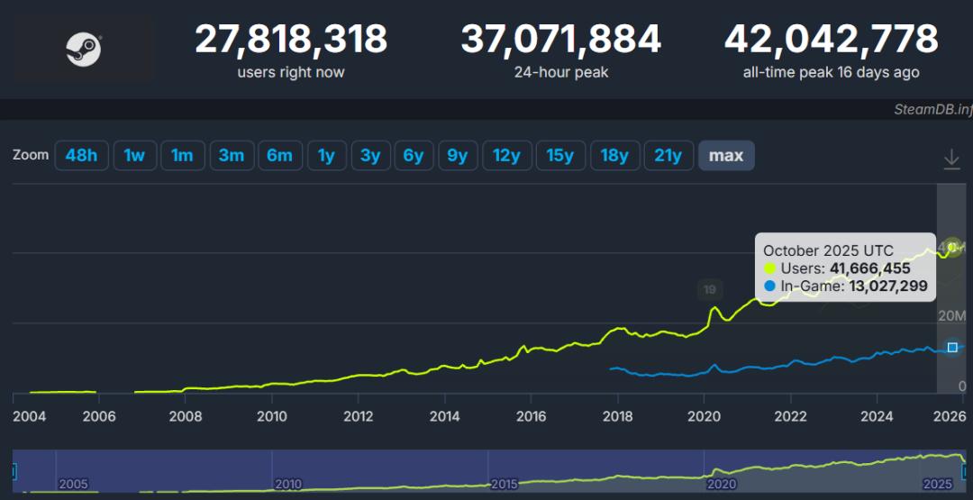 这一年Steam多项大盘数据创新高:根据SteamDB统计,Steam平台日活跃人数(DAU)在2025年10月达到历史峰值4167万,该数据在2026年1月又刷新至4204万。