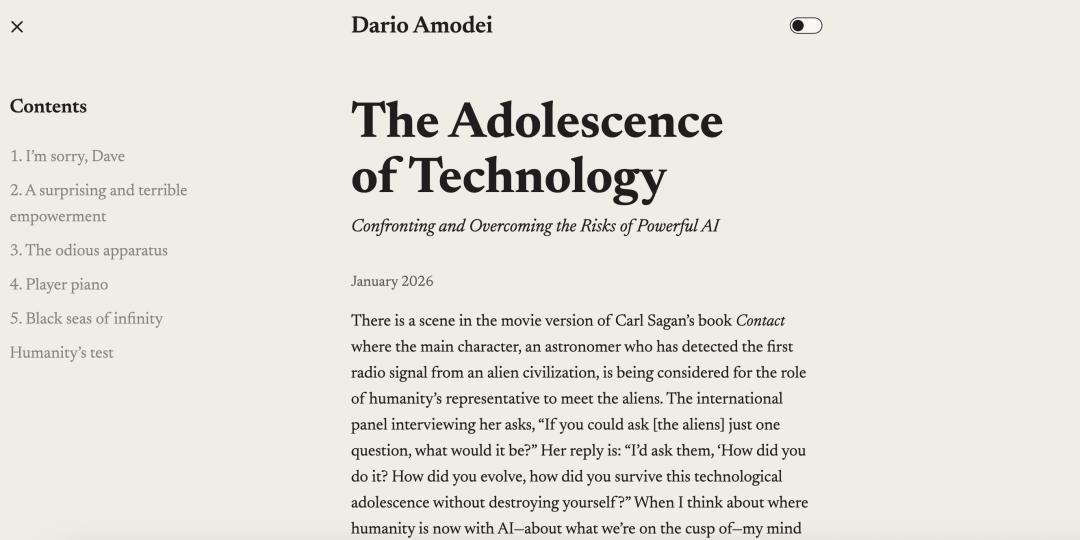 这篇文章名为 《The Adolescence of Technology》(《技术的青春期》)。