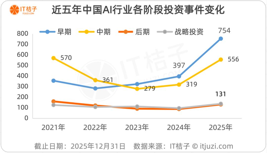 IT桔子数据显示,2025 年国内人工智能领域的早期投资*事件数量激增,同比涨幅高达90%,达到 754 起,创下近五年来的最高纪录。