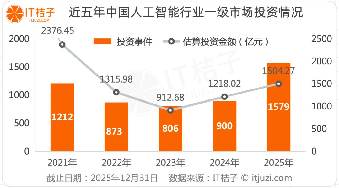 根据IT 桔子数据,2025 年中国人工智能行业一级市场投资热度显著回升。全年投资事件共计 1579 起,同比激增 75%,创下近五年新高。