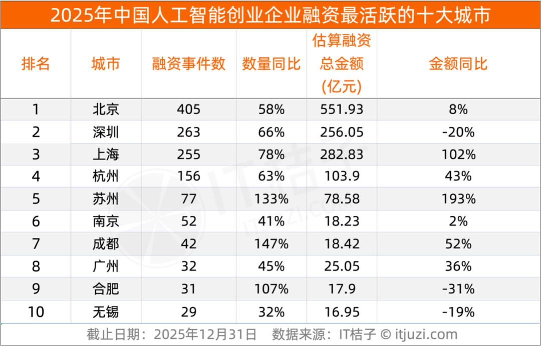 值得关注的是,以长三角为代表的区域协同效应正日益凸显。在前十榜单中,长三角城市占据多席。尤其苏州增速显著,人工智能行业融资笔数实现同比大增133%,也反映“长三角AI产业协同”效应凸显——