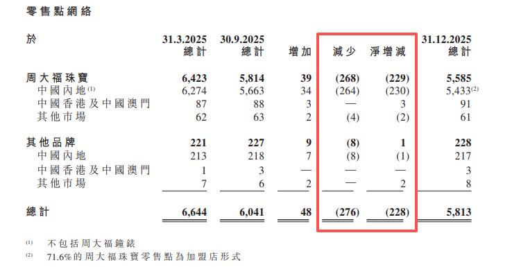 然而站在消费者一侧的金饰品牌,却很难复制这种顺周期红利。高金价明显抑制了按克计价产品的购买意愿,品牌商不得不通过关闭低效门店、优化渠道结构与调整产品组合来应对压力。仅2025年第四季度,周大福就净关闭228个零售点,周大生、六福集团亦呈现出类似的门店收缩与产品“提质”趋势。