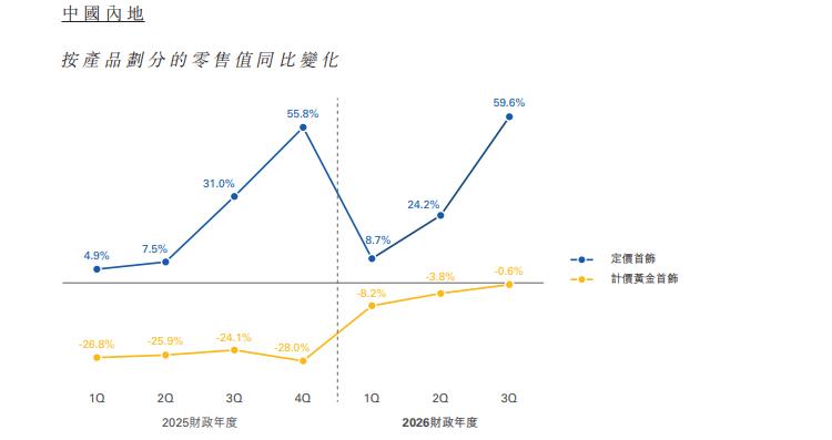 面对这种趋势,品牌需要转变经营思维。如周大福在去年第四季度出现明显的产品结构拐点,定价首饰的零售值同比增长59.6%,收入结构正在逐步摆脱对克重销售的依赖。