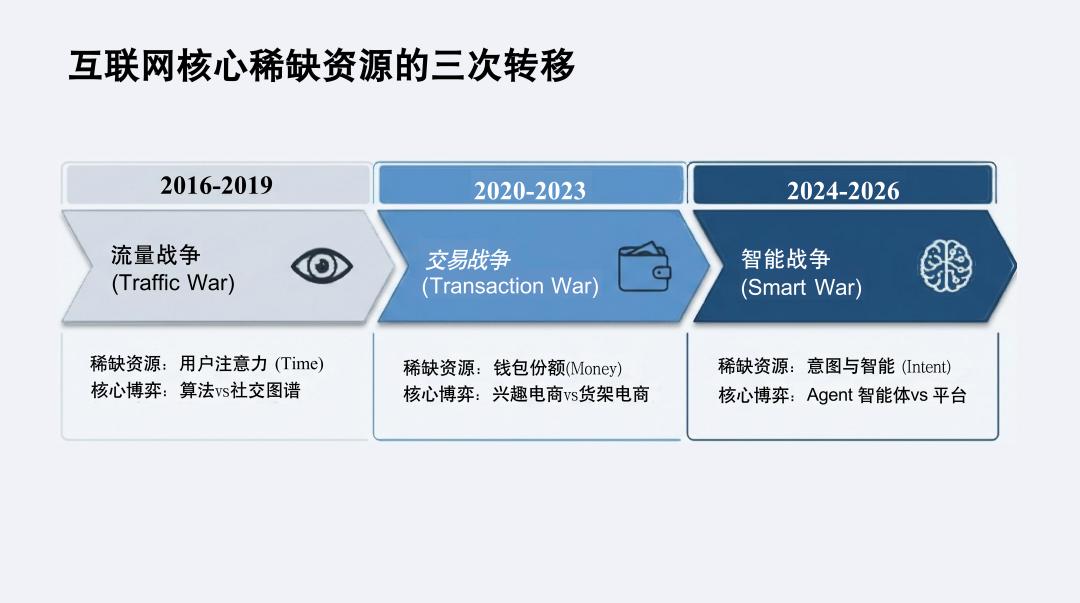 新BAT十年战争 的本质,是互联网核心稀缺资源的转移:从2016年争夺用户注意力的流量战争,到2020年争夺用户钱包份额的交易战争,再到2024年随着生成式AI爆发而升级的智能战争。