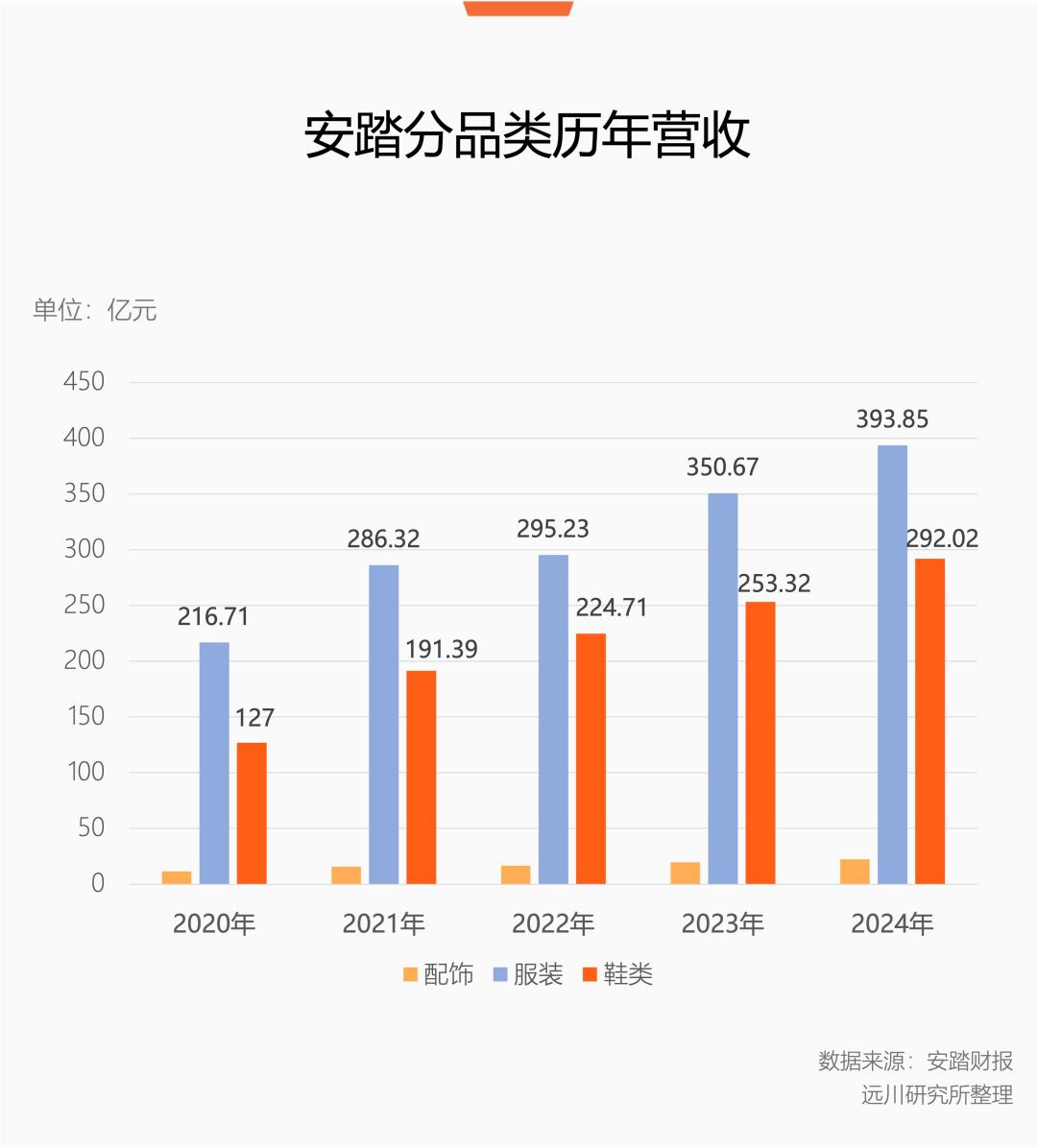 从安踏整体的收入结构看,2024年,安踏的服装类营收394亿,比鞋类多出足足100亿。