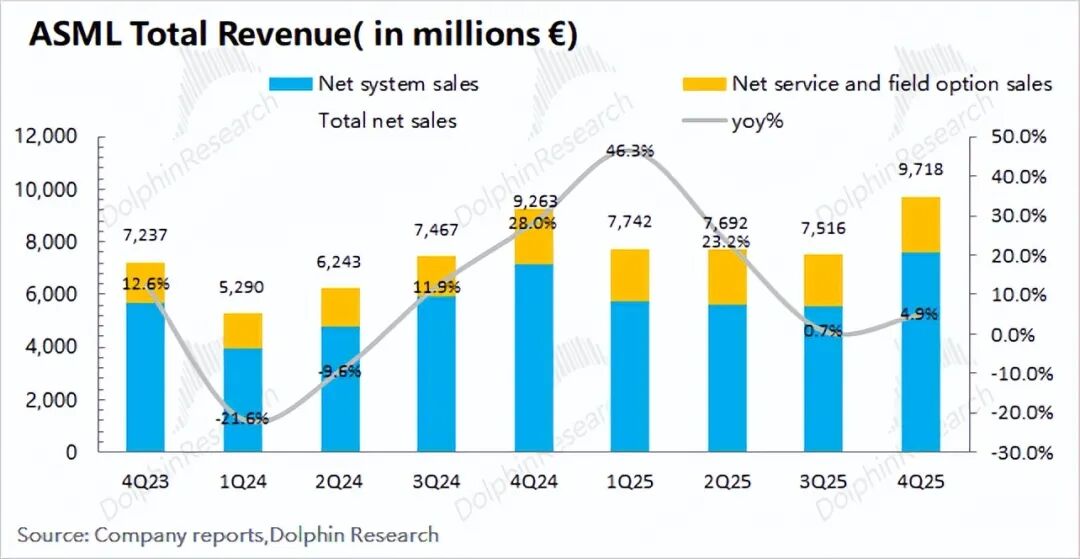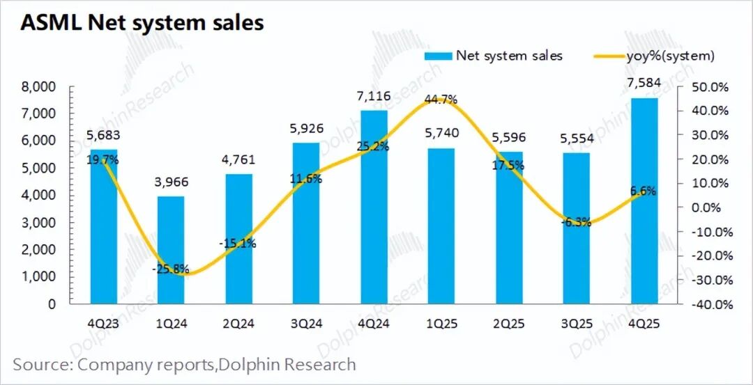 阿斯麦(ASML)的系统销售收入在2025年第四季度实现75.8亿欧元,同比增长6.6%,其中本季度EUV、ArFi和ArF Dry等核心设备都有不同幅度的增长。