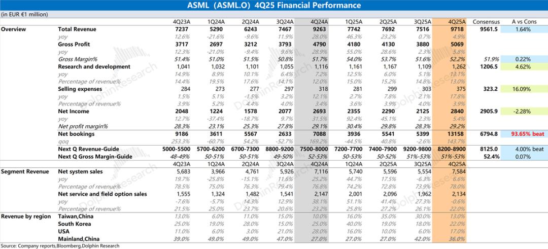 1.2收入端:阿斯麦(ASML)在2025年第四季度实现营收97.2亿欧元,同比增长5%,好于市场预期(95.5亿欧元)。收入同比增长,主要来自于中国大陆地区客户贡献。