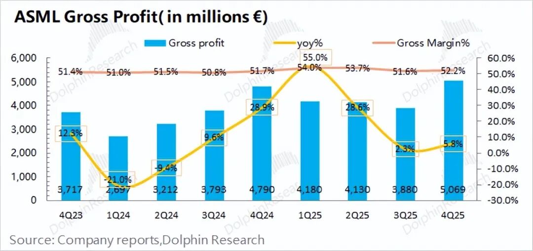 1.3毛利及毛利率:阿斯麦(ASML)在2025年第四季度实现毛利50.7亿欧元,同比增长5.8%。其中毛利率方面,公司本季度毛利率52.2%,同比提升0.5pct,符合公司指引区间(51-53%),主要是受价格较高的EUV收入占比提升的带动。