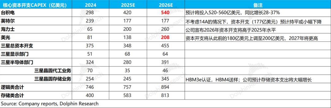综合核心厂商资本开支的情况,海豚君预估2026年逻辑类厂商的资本开支增速有望达到18%左右;而存储类厂商的资本开支增速将接近于40%。虽然阿斯麦ASML本季度的营收和订单还未出现高增表现,但会在2026年后续经营表现中逐步显现。
