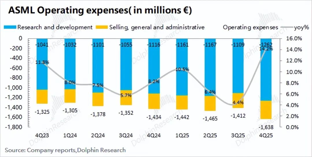 1.4净利润端:阿斯麦(ASML)在2025年第四季度净利润为28.4亿欧元,同比增长5.4%,其中公司本季度净利率为29.2%。其中公司本季度经营费用端有所增长,经营费用率维持在17%左右。