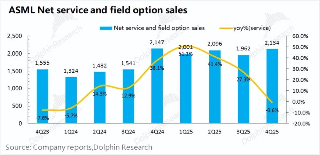 阿斯麦(ASML)的服务收入在2025年第四季度实现21.3亿欧元,同比下滑0.6%。阿斯麦的服务收入,主要包括设备维护等项目,受行业周期影响较小。