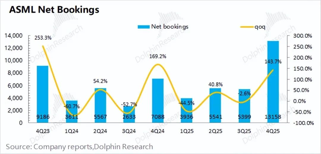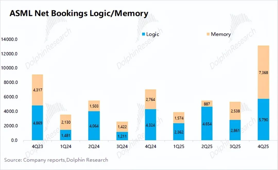 具体来看:①逻辑类订单:本季度为58亿欧元,环比增量30亿(符合季节性波动);②存储类订单:本季度为74亿欧元,环比增长49亿(远好于历史同期)。