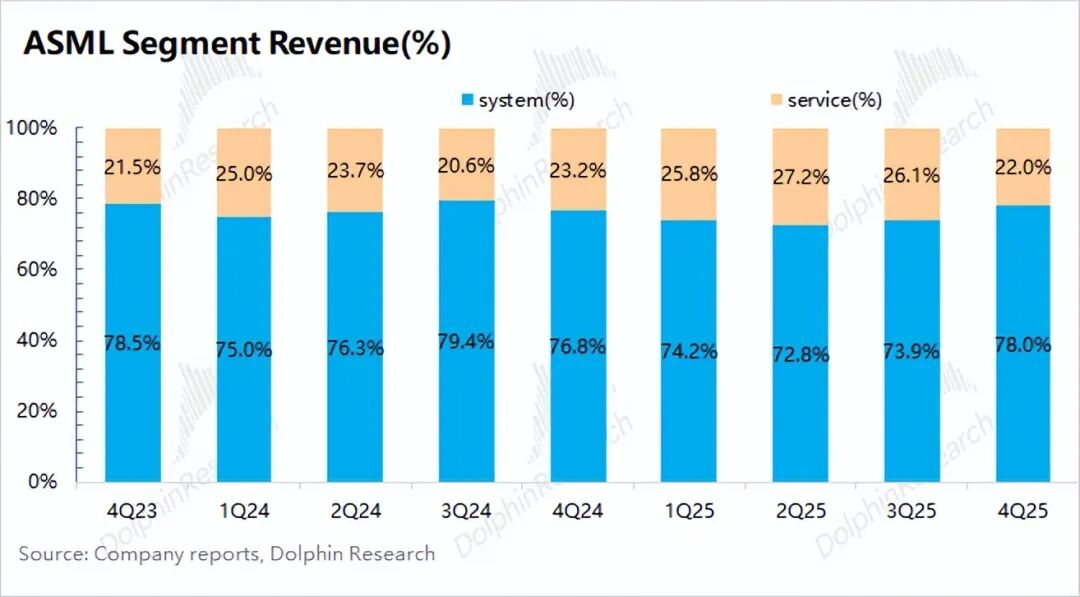 阿斯麦(ASML)的业务由系统销售收入和服务收入两部分构成。其中服务性收入保持稳定,公司最核心的光刻系统销售收入(接近8成)是本季度增长的主要推动力。
