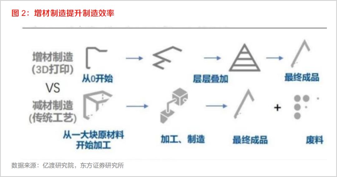 从制造工艺来看,传统的工业制造属于减材制造,通过削、刨、铣等将原始材料削减加工为所需形状和尺寸,而制造形状复杂或大型结构件则存在加工成型难题,需要先加工成多个零部件再组装,不仅程序较多加工成本高,且材料利用率较低。