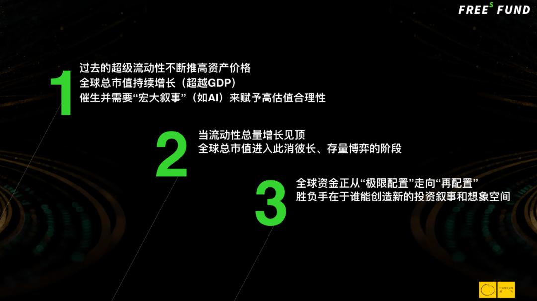 在假设全球不再激进放水、流动性水位基本稳定的前提下,资金只能在全球范围内寻找相对确定、具备中等以上增长和回报的资产,同时避免继续高度集中在美元体系。
