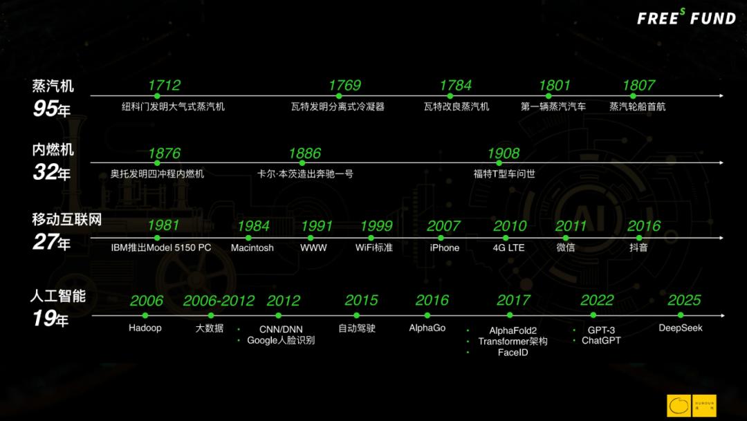 蒸汽机从1712年诞生,到蒸汽汽车、蒸汽轮船真正落地,用了95年;互联网从1981年个人电脑出现,到 iPhone 和微信成为国民级应用,也用了约30年。