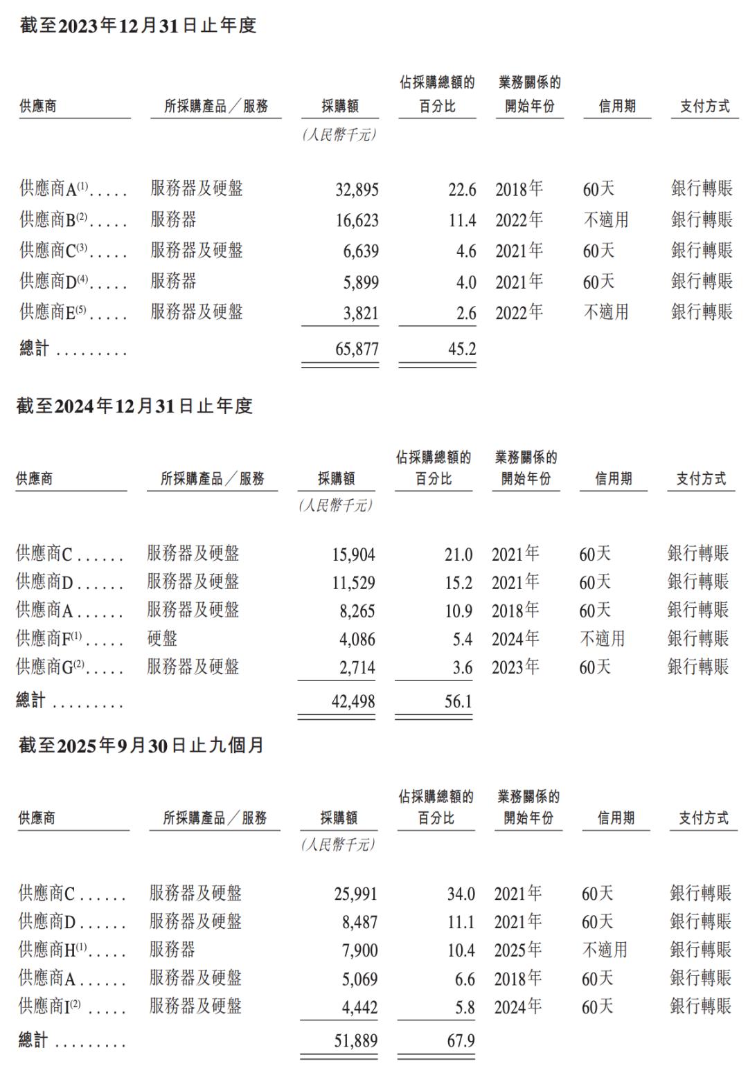 该公司的供应商主要包括原始零部件制造商,2023年、2024年至2025年9月,其向前五大供应商的采购额分别为0.66亿元、0.43亿元、0.52亿元,分别占同期采购总额的45.2%、56.1%及67.9%。