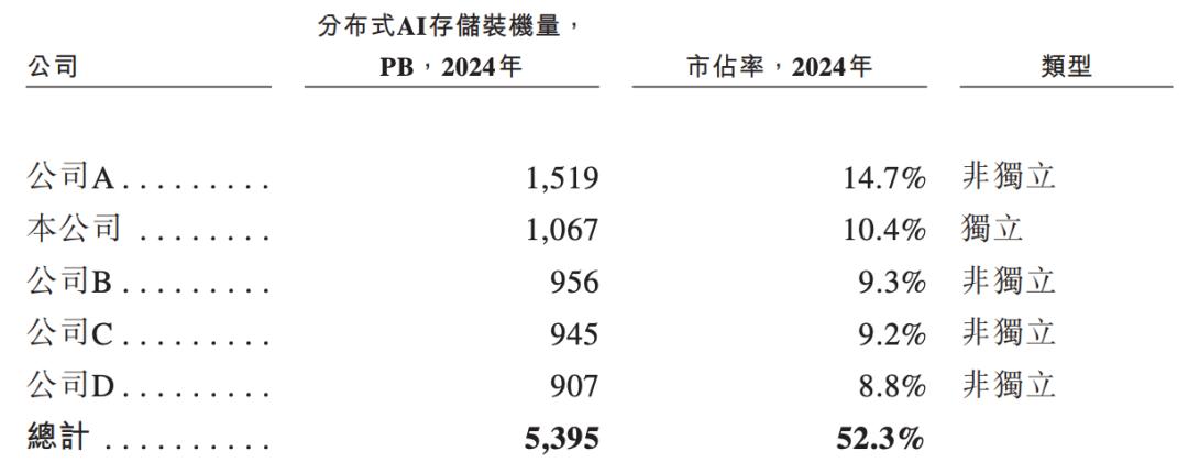 根据灼识咨询的数据,按2024年装机量计,星辰天合是中国最大独立分布式AI存储解决方案提供商,是中国第二大分布式AI存储解决方案提供商,市场份额达到10.4%。根据附注估计,公司A、B、C、D可能为华为、浪潮信息、新华三、中科曙光。