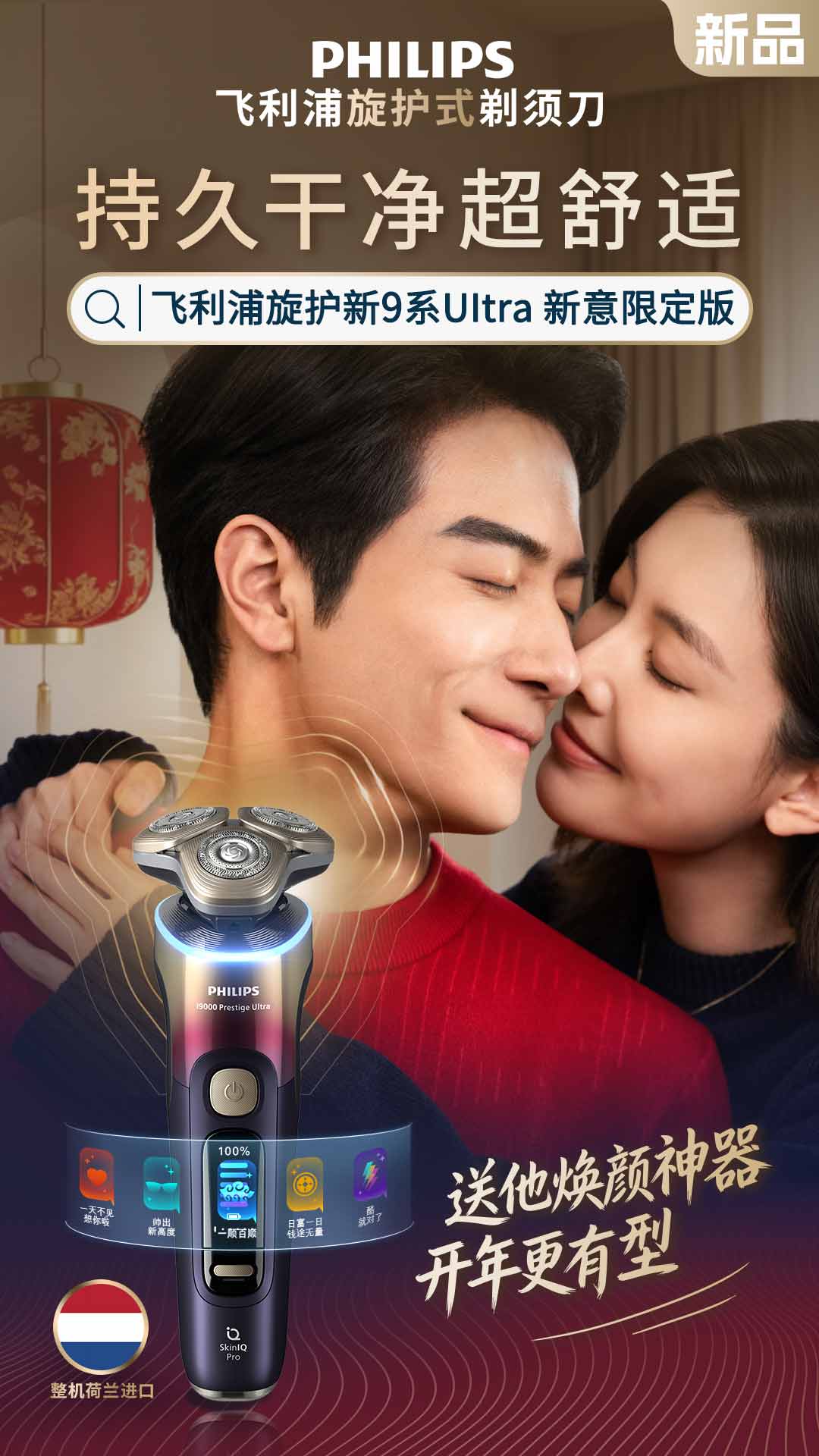 飞利浦作为全球电动剃须刀领导品牌,拥有超85年的男士理容经验。本次推出的旋护新9系Ultra新意限定版,依托飞利浦专研微提切旋护科技,实现净护合一,持久干净超舒适。自带5款专属开机新意动画,成为新年传递专属心意的最佳选择。