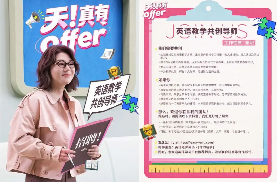 其后,杨天真《天!真有offer》内容中官宣招聘“英语教学共创导师”。