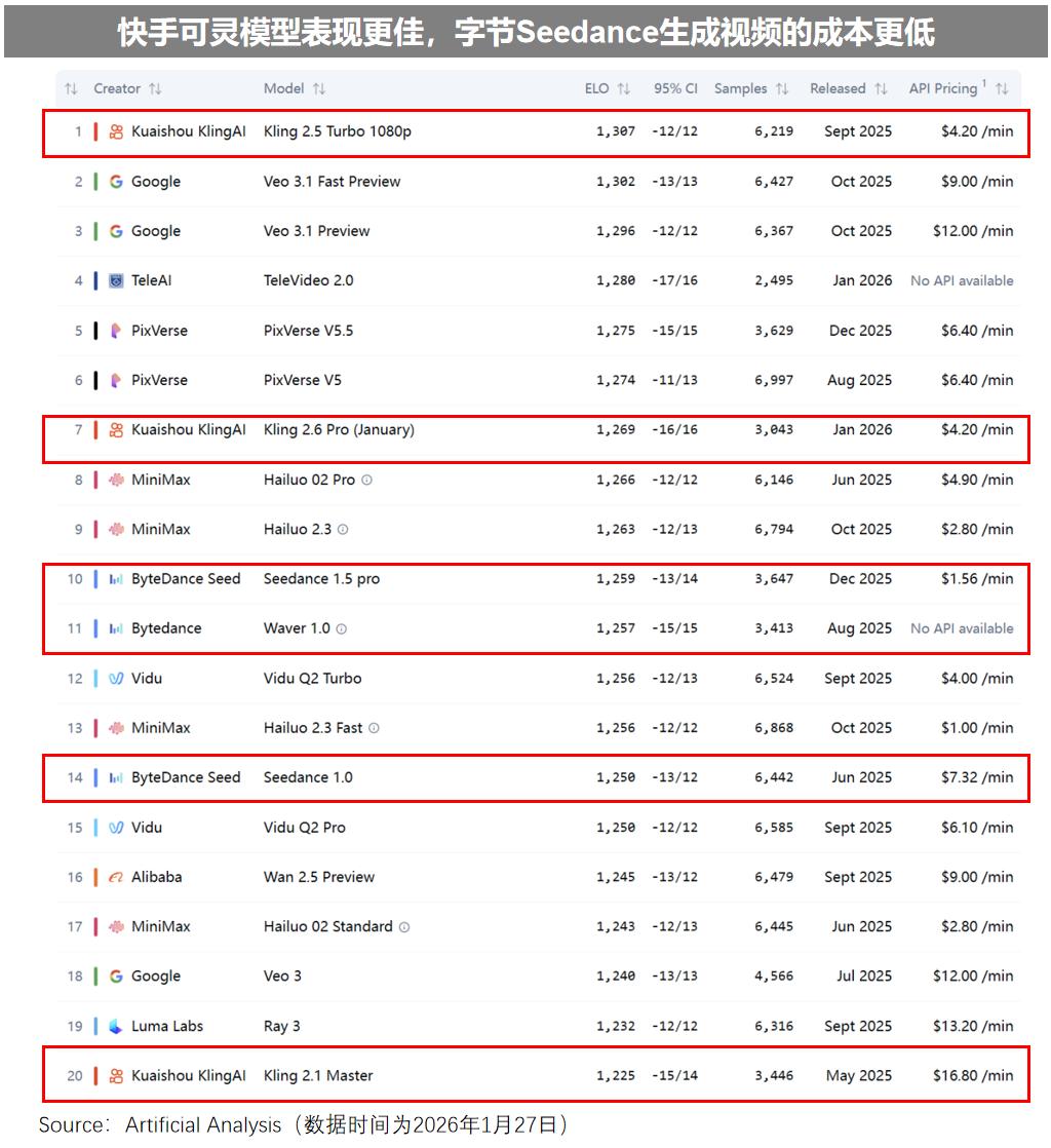 这不仅浪费时间,更烧钱如流水。据第三方评测榜单Artificial Analysis,可灵2.6Pro每分钟生成成本为4.2美元,谷歌Veo 3.1平均每分钟生成成本高达10.5美元。