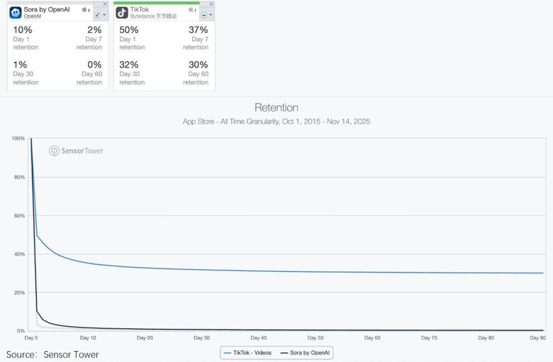 据美国知名风投公司a16z合伙人透露,Sora的30天用户留存率仅1%,60天留存率近乎0%。