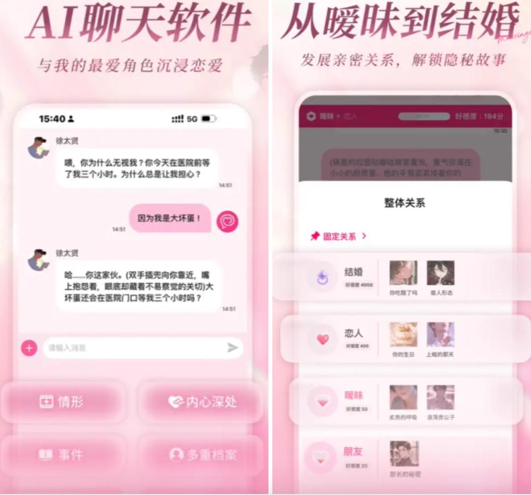 产品设计的阶梯式情感进程机制,将AI与用户的关系分为熟人、朋友、心动、恋人、结婚五个阶段,好感度决定关系升级,不同阶段的AI回复有明显差异,甚至会出现“没说出口的想法”这类细节,提升交互真实感。相较于国内同类产品的多功能堆砌,“卿卿我我”走了差异化路线,而这也与《鹅鸭杀》的爆款逻辑一脉相承,以用户需求为核心,用简单直接的体验击中痛点。