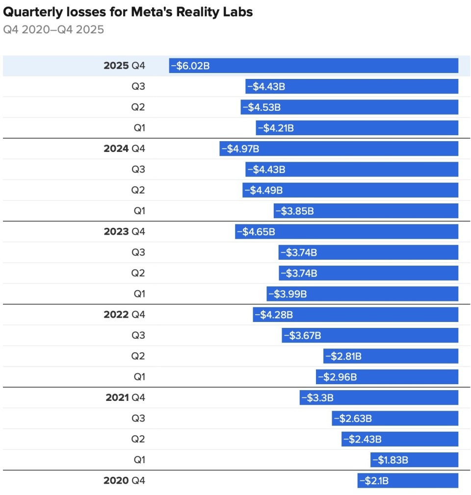 2020年第四季度至2025年第四季度Reality Labs的亏损情况