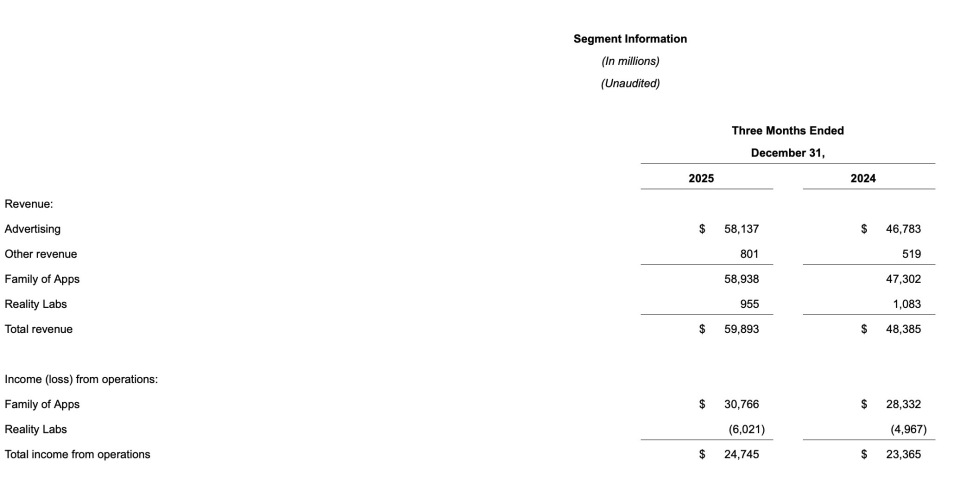在此背景下,Meta第四季度运营利润为247.45亿美元,同比仅增长6%。分业务来看,应用家族仍贡献主要利润来源,当季运营利润为307.66亿美元;Reality Labs 继续拖累整体盈利,当季运营亏损扩大至60.21亿美元。