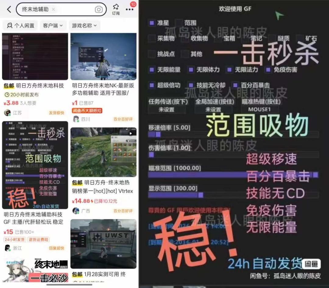 有外挂商家向《BUG》栏目透露,此类外挂主要适用于《明日方舟:终末地》PC端,核心功能包括透视宝箱、无限冲刺、伤害翻倍、地图传送等,能大幅降低游戏难度。当被问及使用风险时,商家信誓旦旦承诺“目前为止0封,不用担心账号被封情况”,甚至表示可提供售后指导,确保外挂稳定运行。