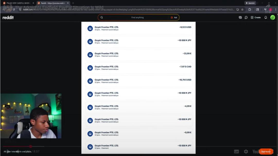 更有用户晒出截图,显示账户在未操作情况下被跨币种、跨账户异常扣费。多名海外游戏博主在直播中实时证实了这一BUG,引发玩家对账户安全的担忧。