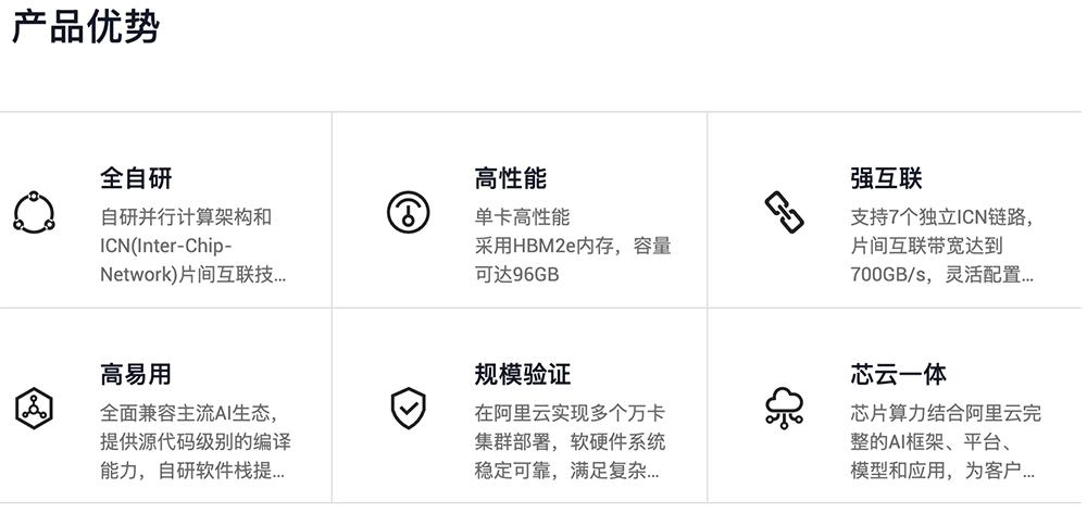平头哥官网列出了真武910E的六大优势:全自研、高性能、强互联、高易用、规模验证、芯云一体。