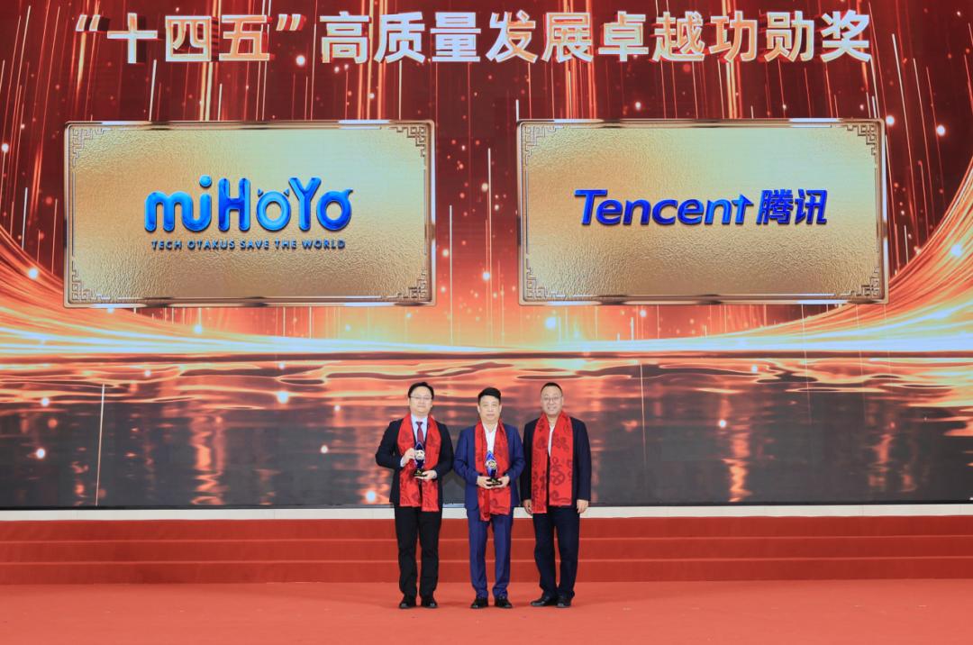 就在前不久(1月26日),在西岸国际会展中心举行的2025年度徐汇区招商引资表彰大会上,腾讯和米哈游作为“十四五”期间(2021-2025)为徐汇区域经济发展作出重大贡献的企业,获得了徐汇区颁发的“十四五”高质量发展卓越功勋奖。