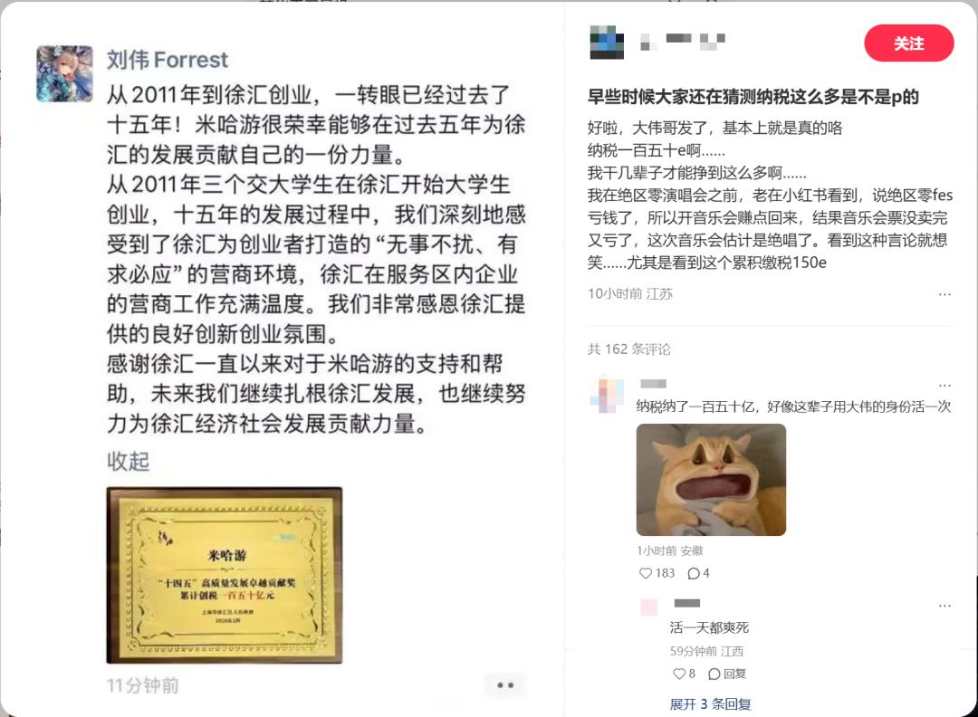 米哈游首次官宣:5年累计创税150亿,大伟哥感谢上海徐汇