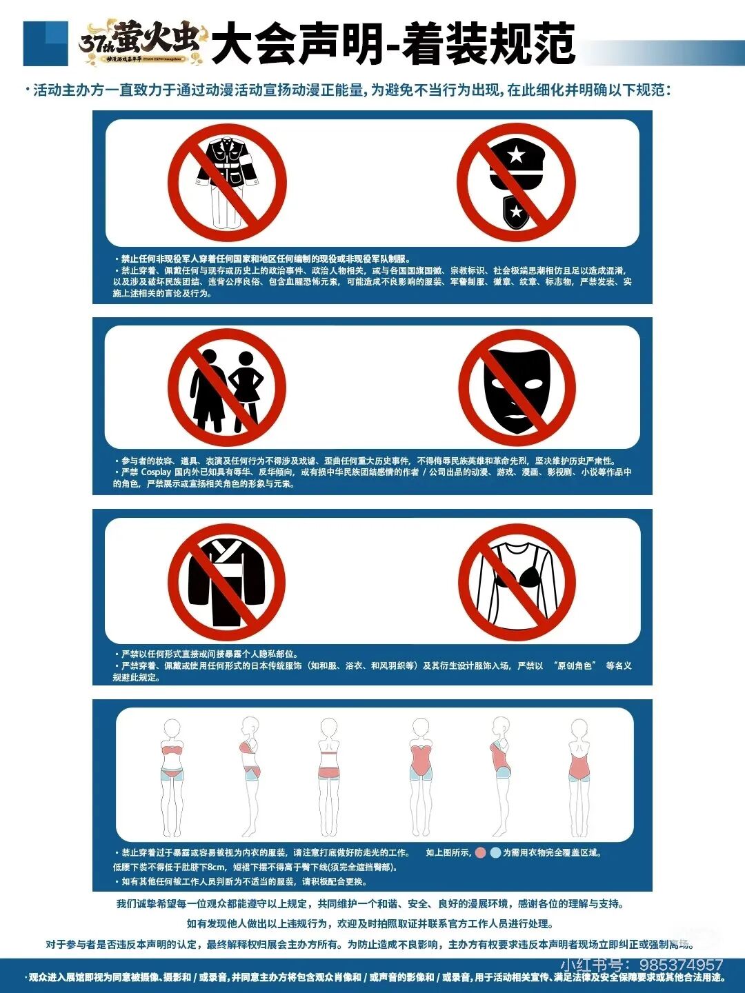 在第37届萤火虫动漫游戏嘉年华开场前8天的时候,官方也再次重申了着装规范,严禁穿着、佩戴或使用任何形式的日本传统服饰(如和服、浴衣、和风羽织等)及其衍生设计服饰入场。