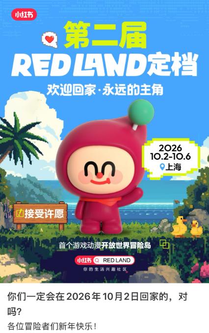 而小红书的RED LAND则是把时间定在了2026年的国庆节,从10月2日开始,到10月6日结束,时间长达5天。要知道在2025年,小红书在BW结束才官宣将于8月份在上海复兴岛举办RED LAND,而活动也只持续了三天。今年提前10个月官宣,超长的筹备期,超长的体验时间,此次小红书对第二届的RED LAND有着更大的期待。