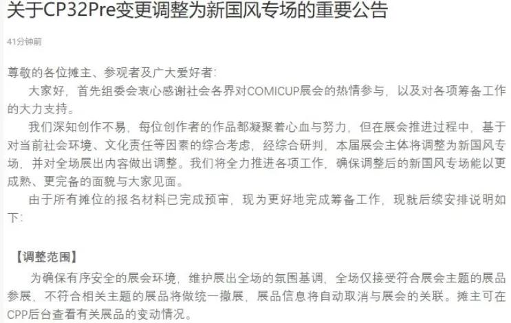 2025年12月19日,距离CP32Pre开场还有不到10天的时间,官方临时通知CP32Pre将调整为以本土ACGIP为主的“新国风”专场,以日本ACG作品为主的大量非国风IP被“一刀切”。