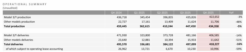 特斯拉2025年第四季度汽车产量和交付数据